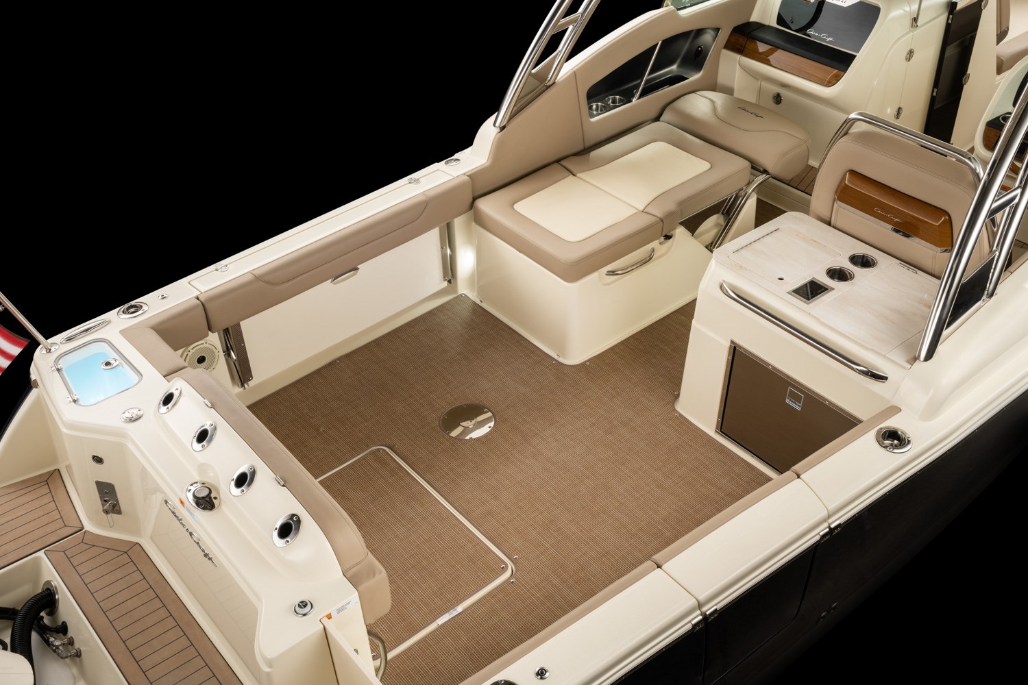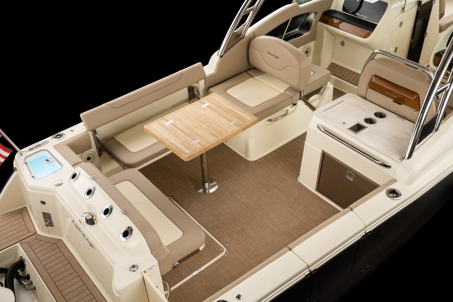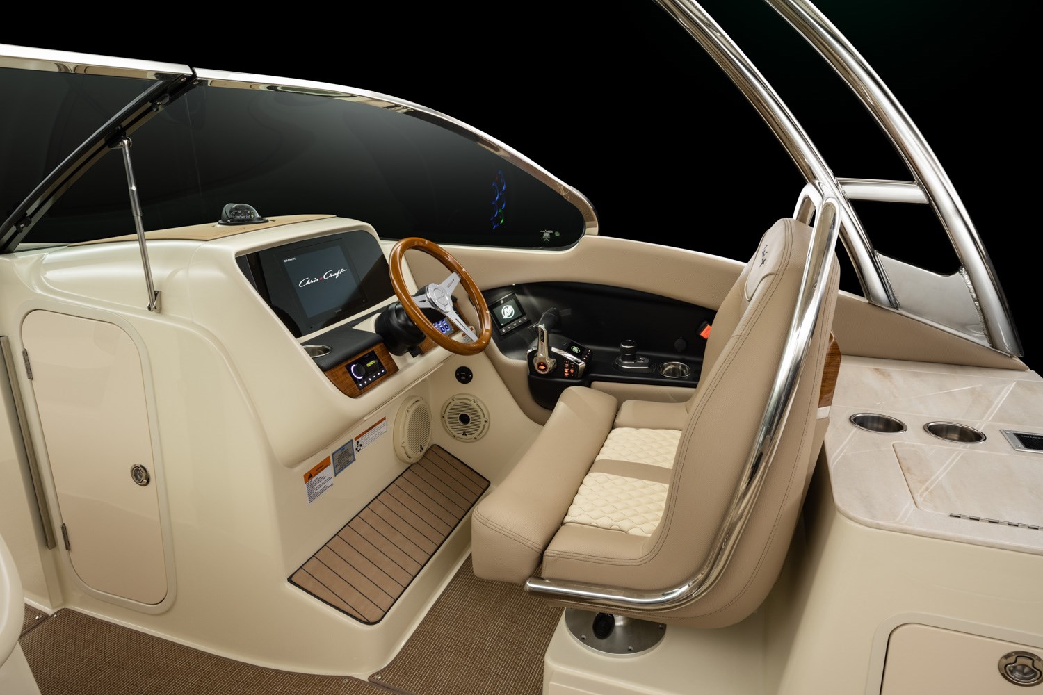 The strikingly styled helm comes standard with a flush-mounted 12” Garmin display, glass cockpit, a high gloss teak steering wheel and accents, and new Mercury Smartcraft Premier controls. The double-wide helm chair with thigh bolster and stainless-steel trim ensures a comfortable ride.