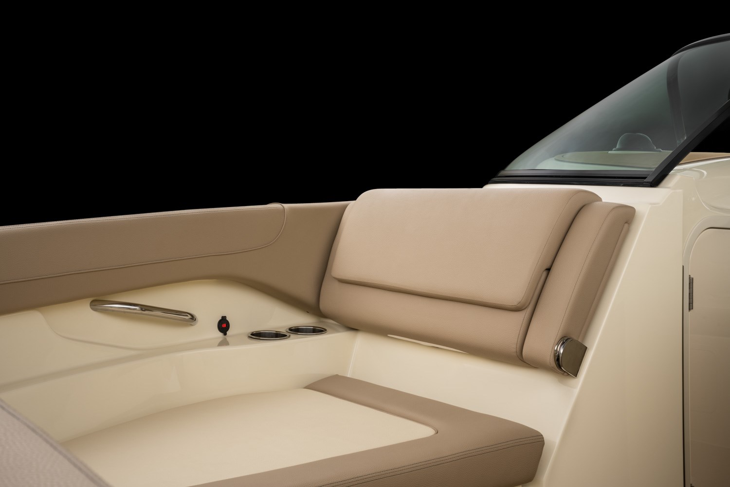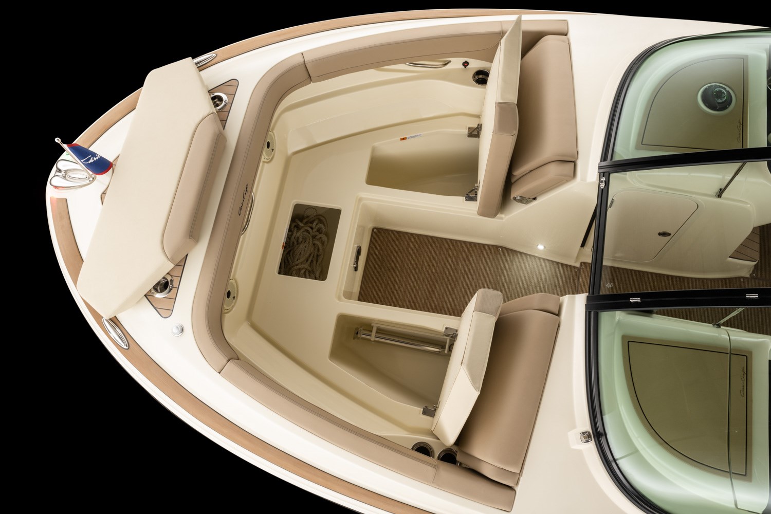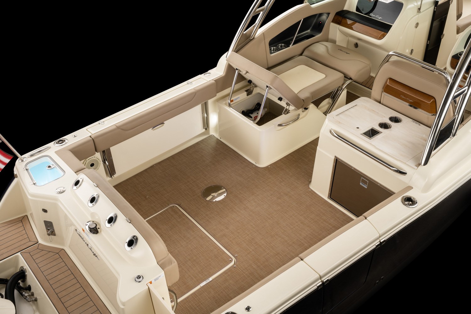 The strikingly styled helm comes standard with a flush-mounted 12” Garmin display, glass cockpit, a high gloss teak steering wheel and accents, and new Mercury Smartcraft Premier controls. The double-wide helm chair with thigh bolster and stainless-steel trim ensures a comfortable ride.