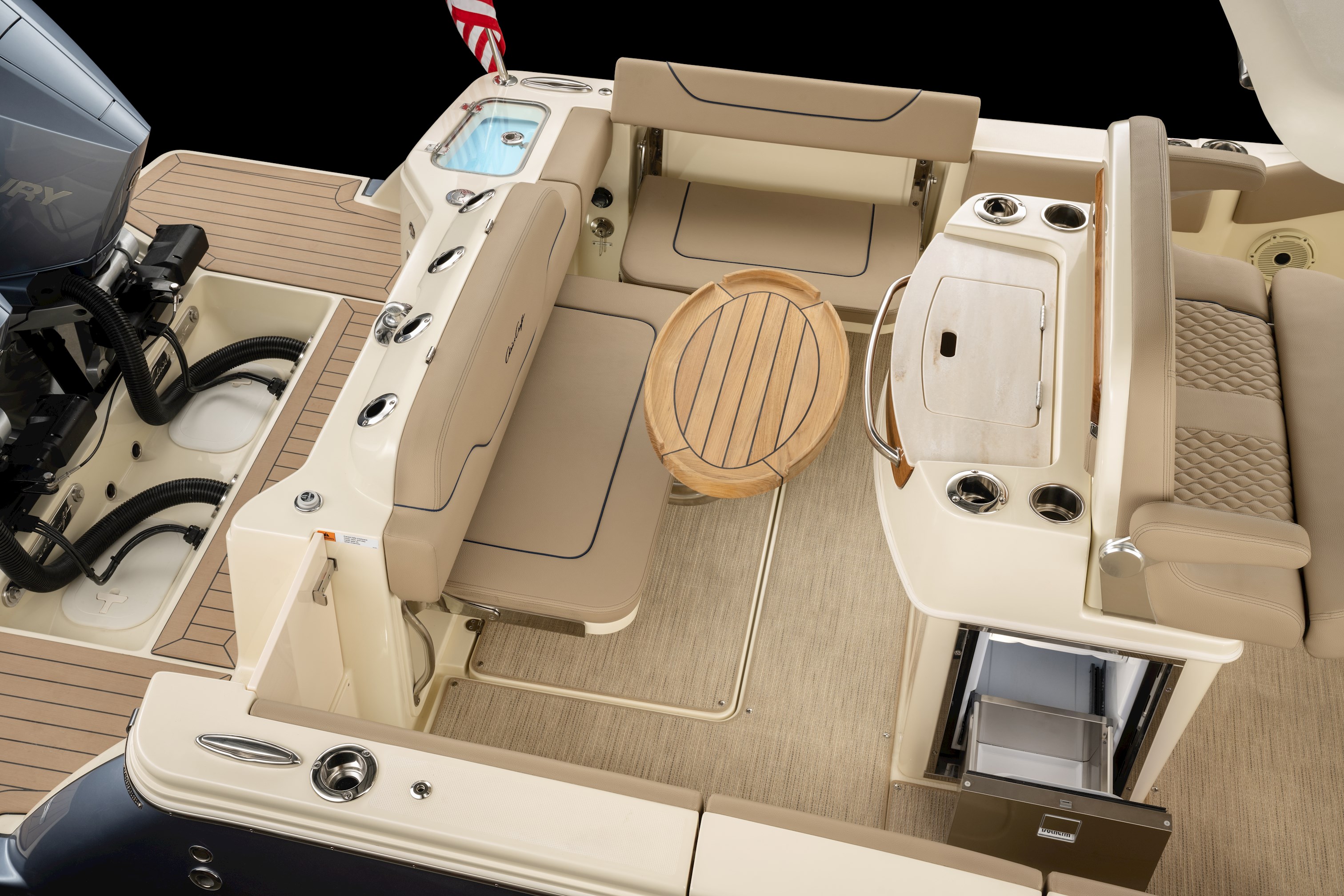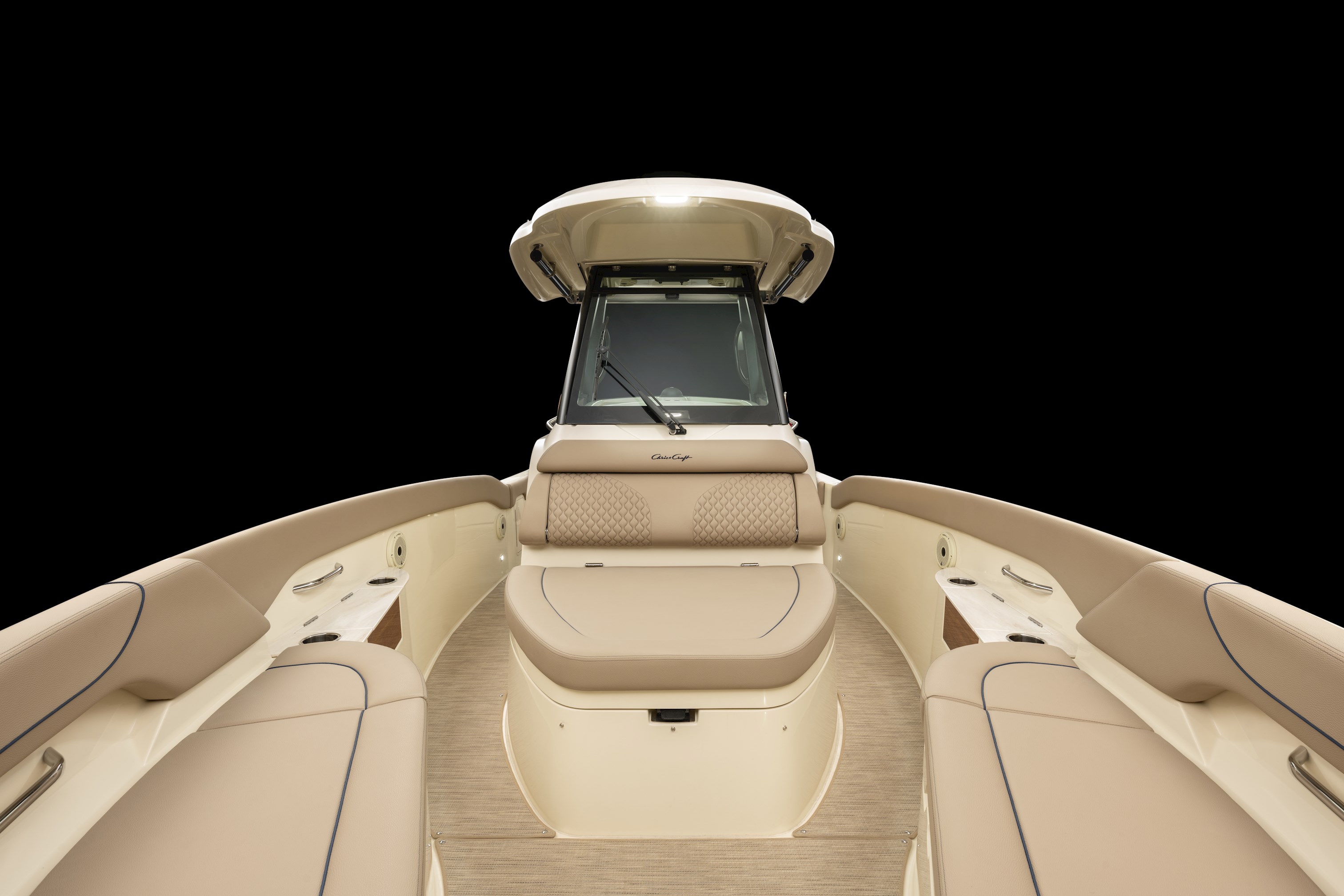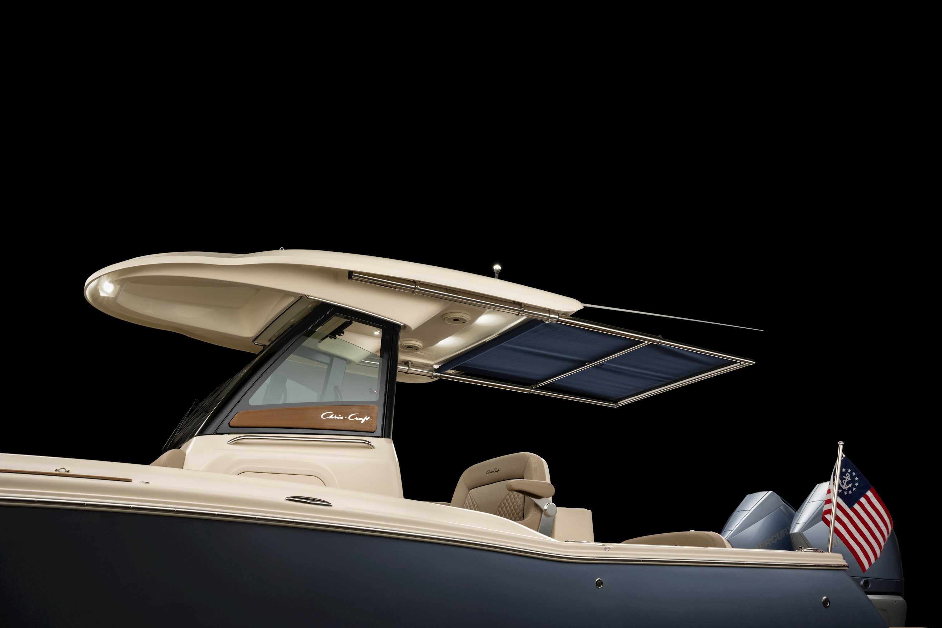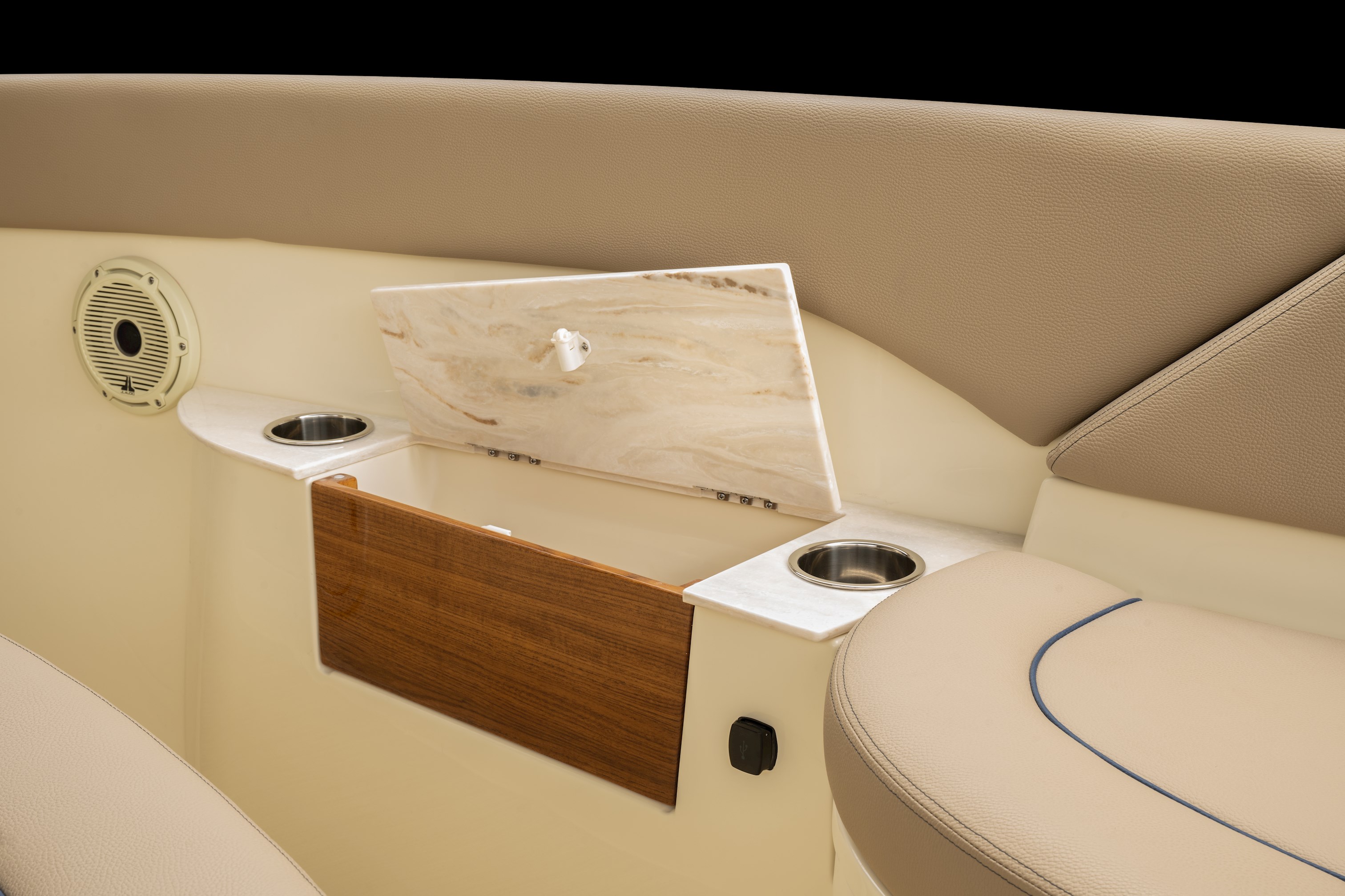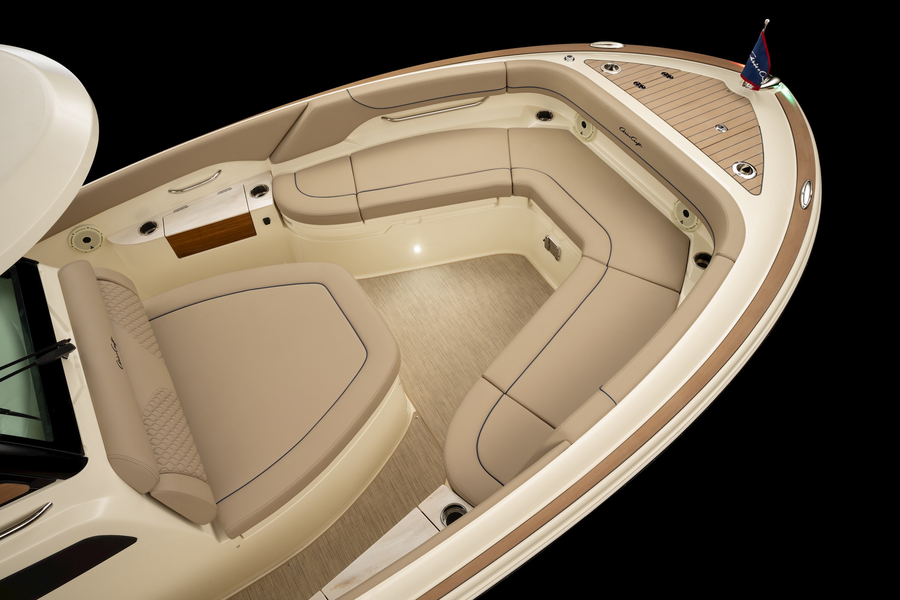 The elegantly styled helm features flush-mounted electronics with a 12" Garmin Multifunction Display with CZone Switching, and the option to upgrade to twin 12" Garmin screens. The Garmin displays a custom Chris-Craft home screen that matches the look and feel of the boat. The high gloss teak accents and steering wheel add another touch of classic styling to the helm.