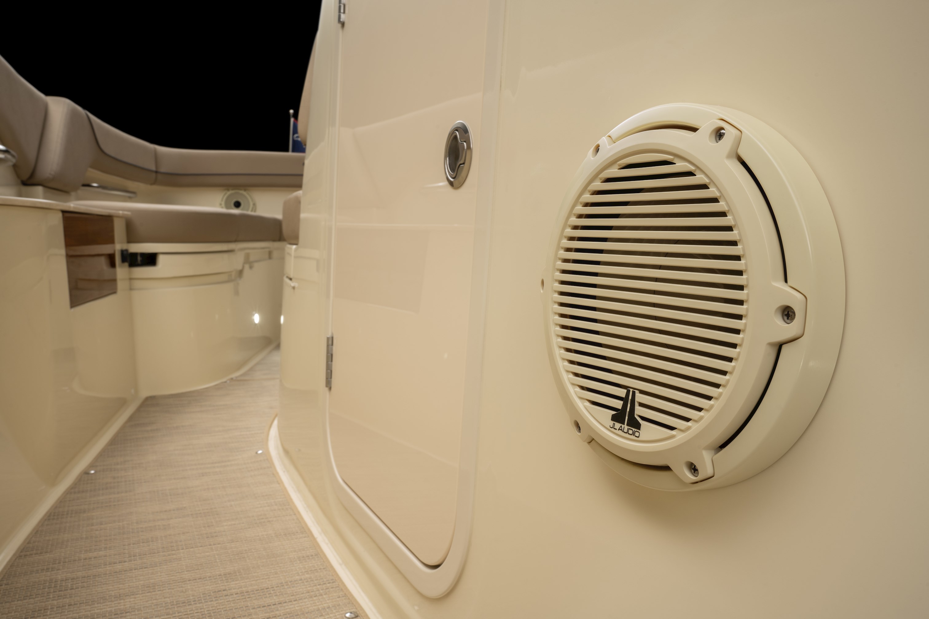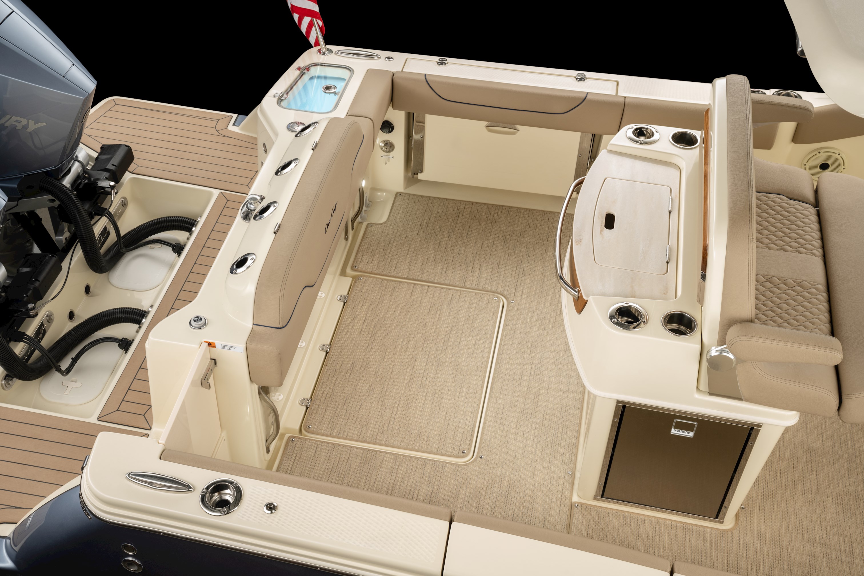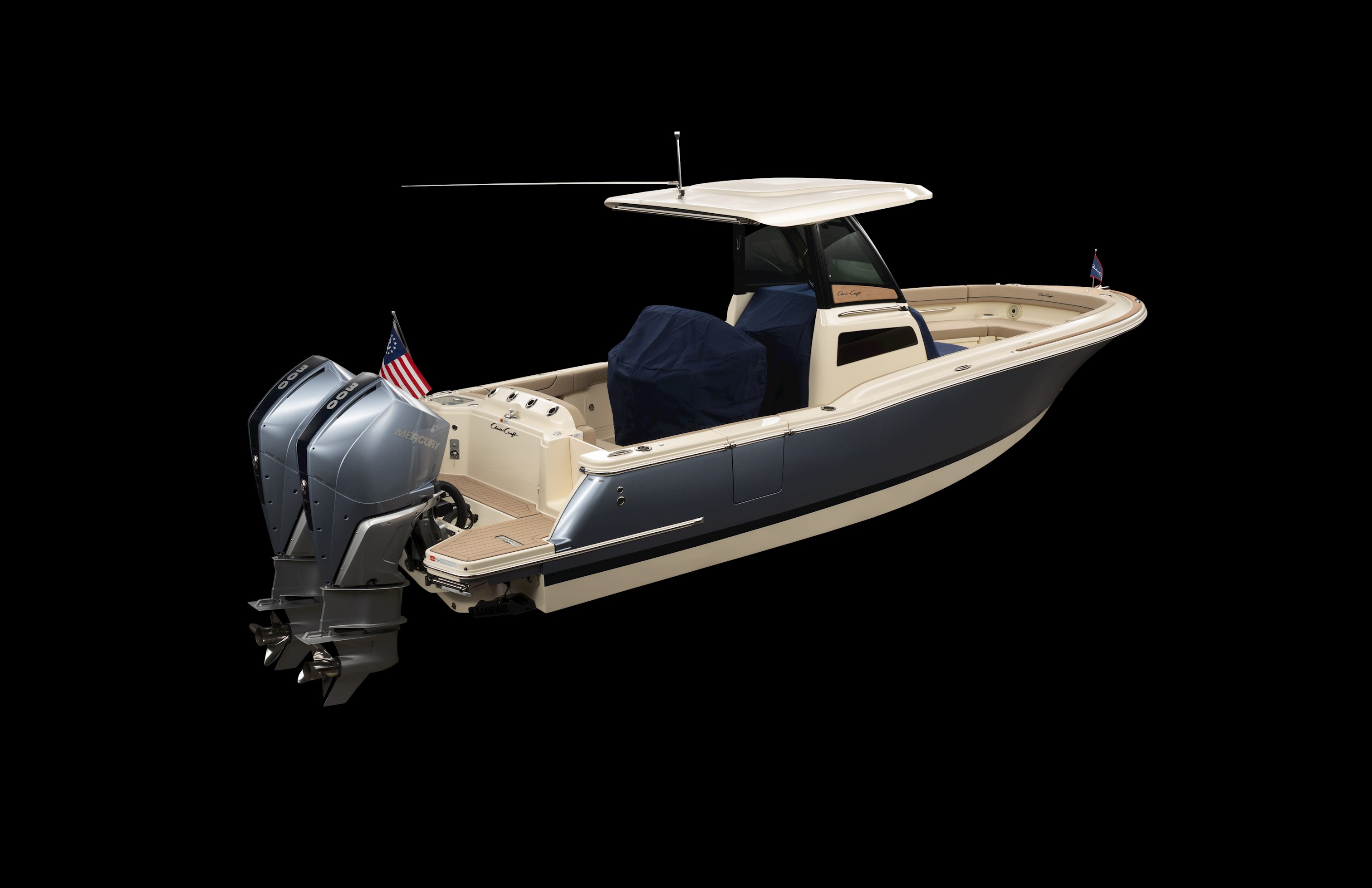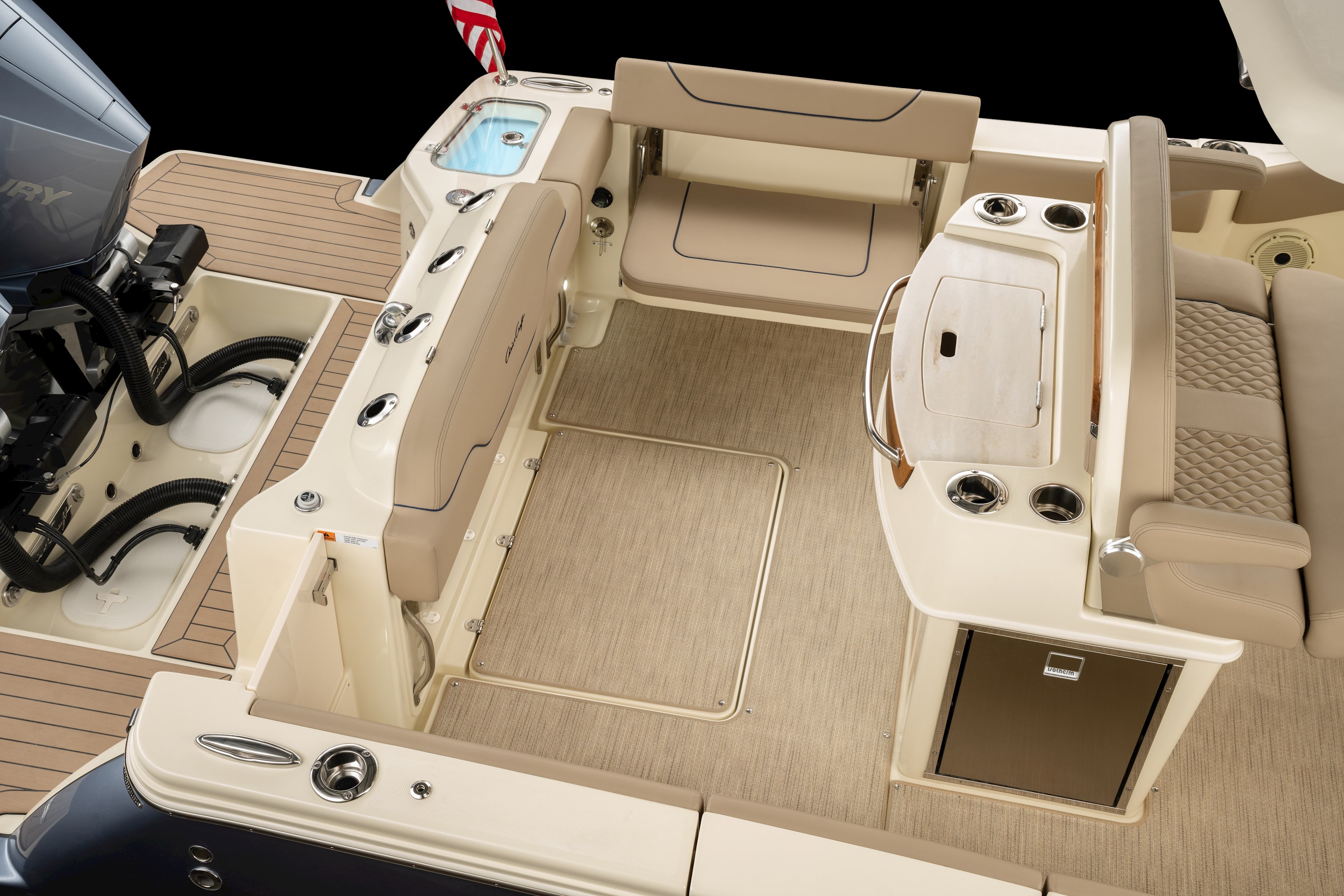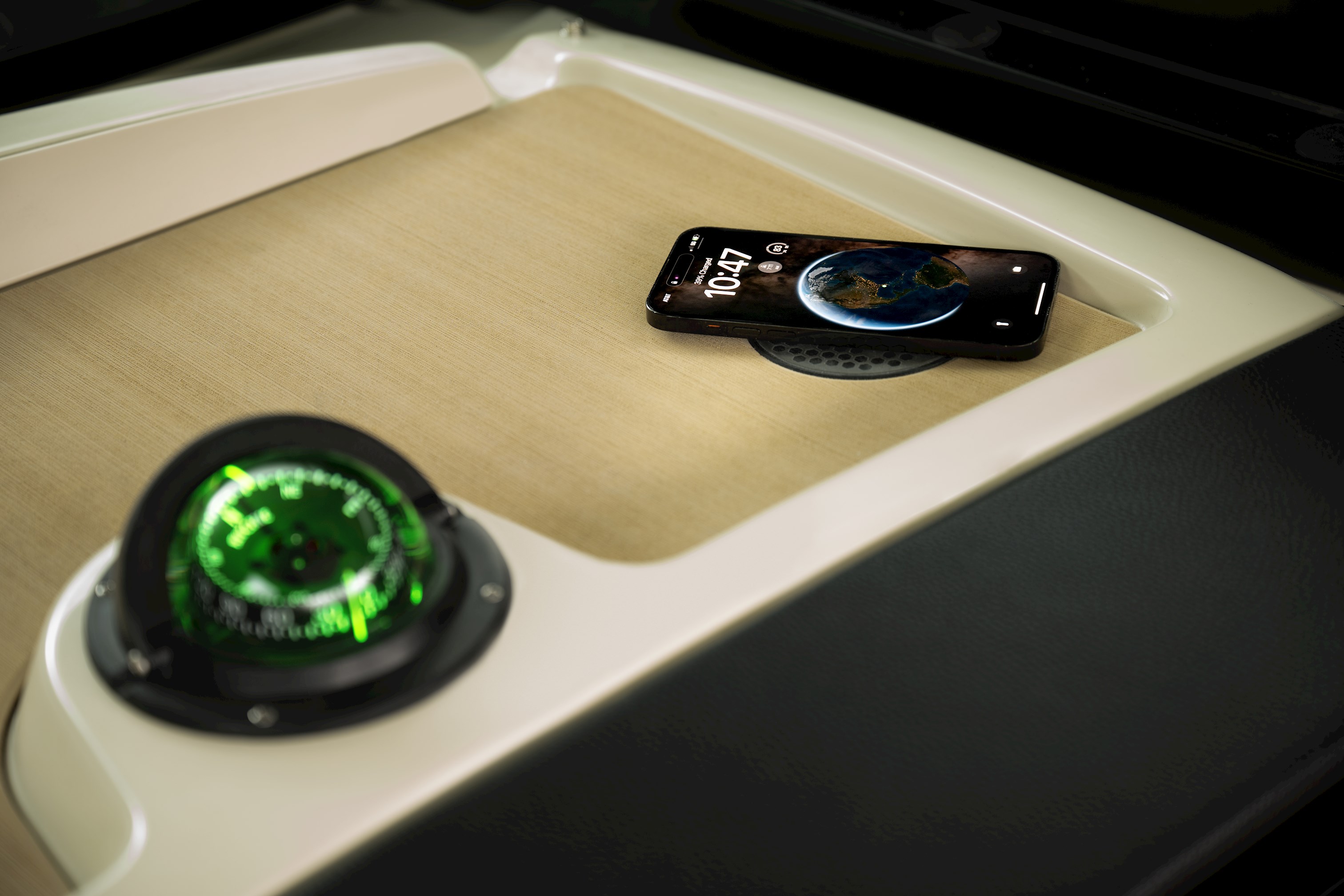 The elegantly styled helm features flush-mounted electronics with a 12" Garmin Multifunction Display with CZone Switching, and the option to upgrade to twin 12" Garmin screens. The Garmin displays a custom Chris-Craft home screen that matches the look and feel of the boat. The high gloss teak accents and steering wheel add another touch of classic styling to the helm.