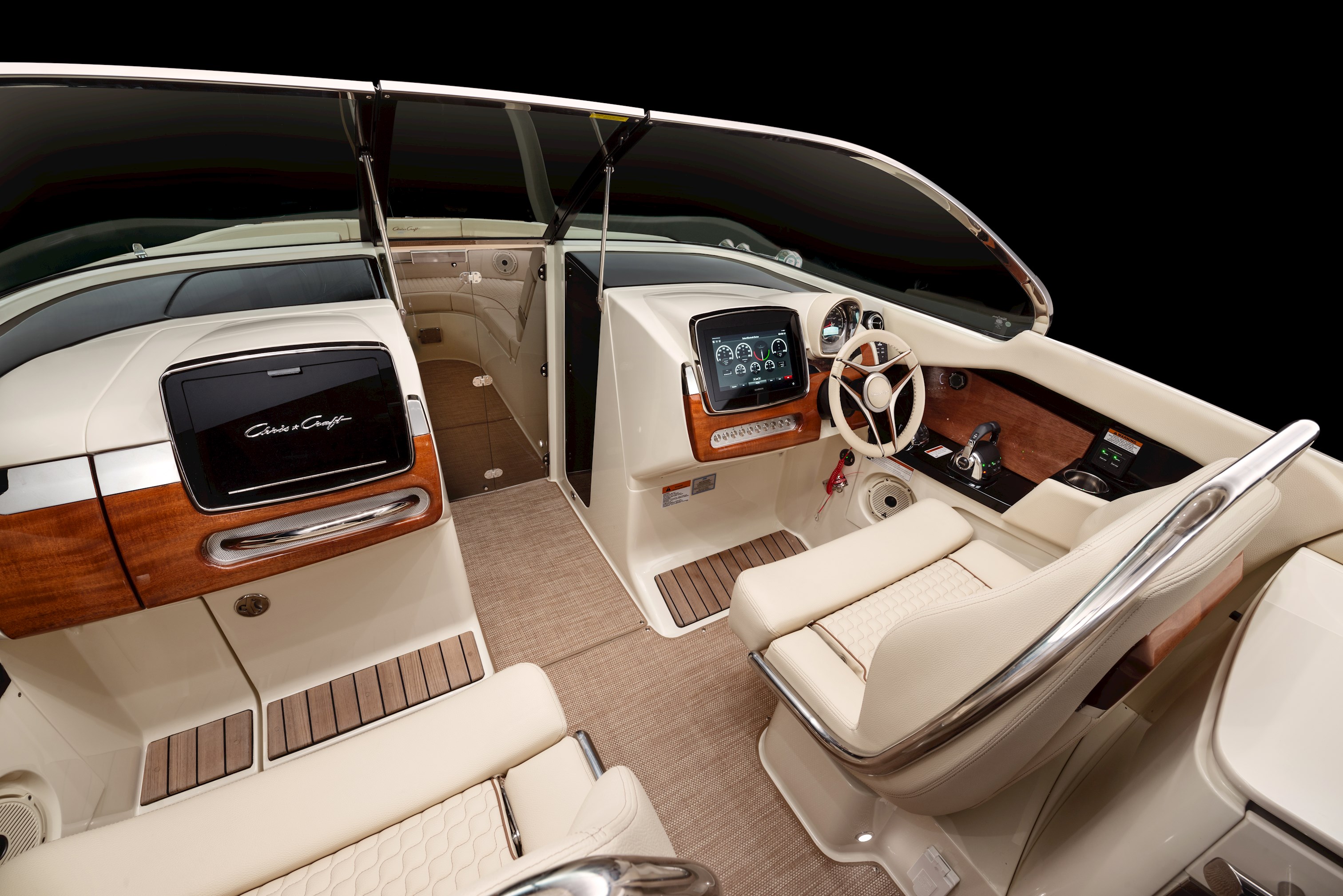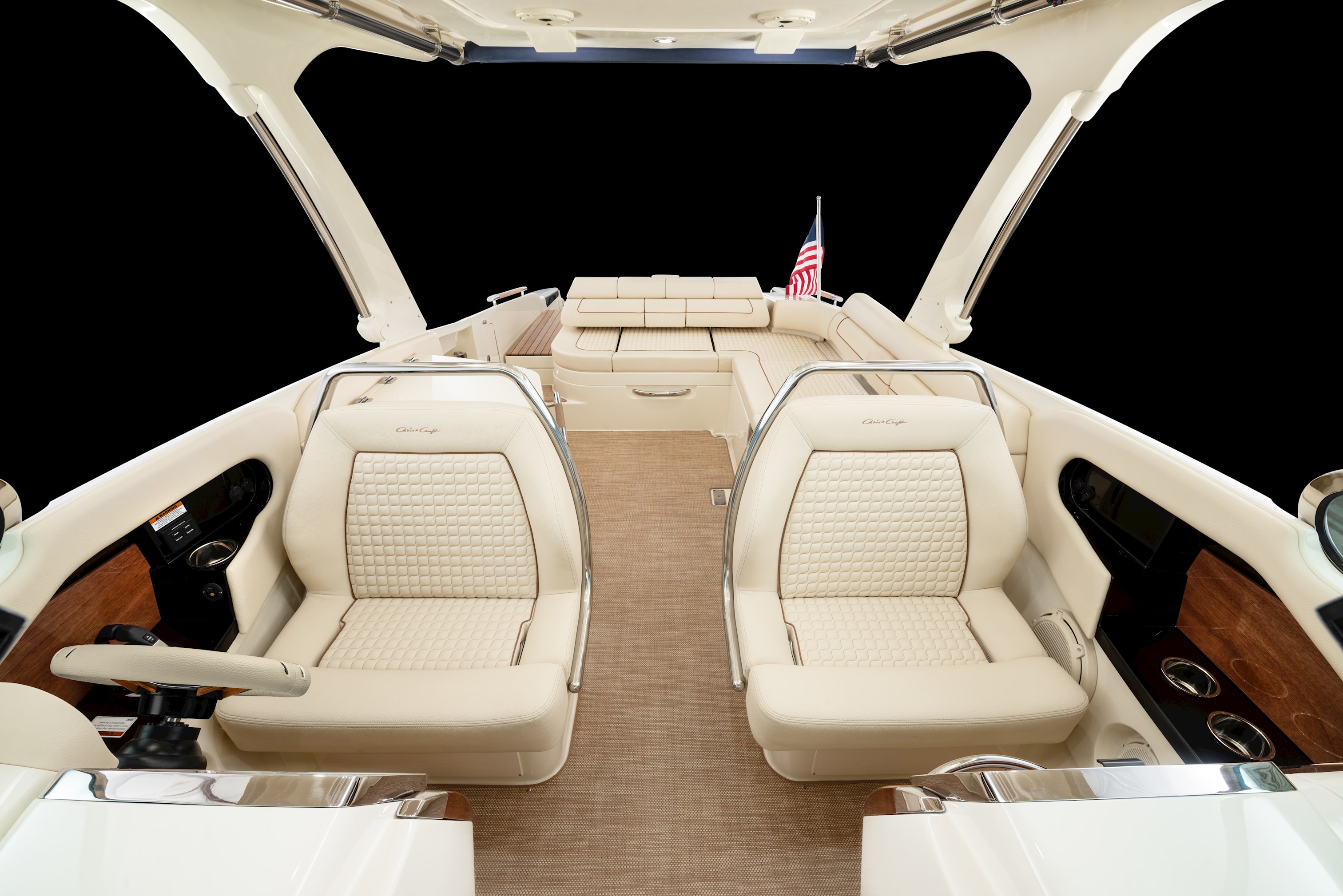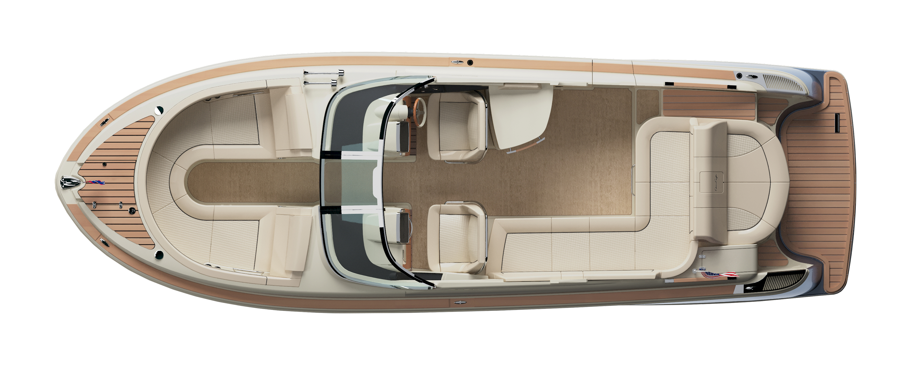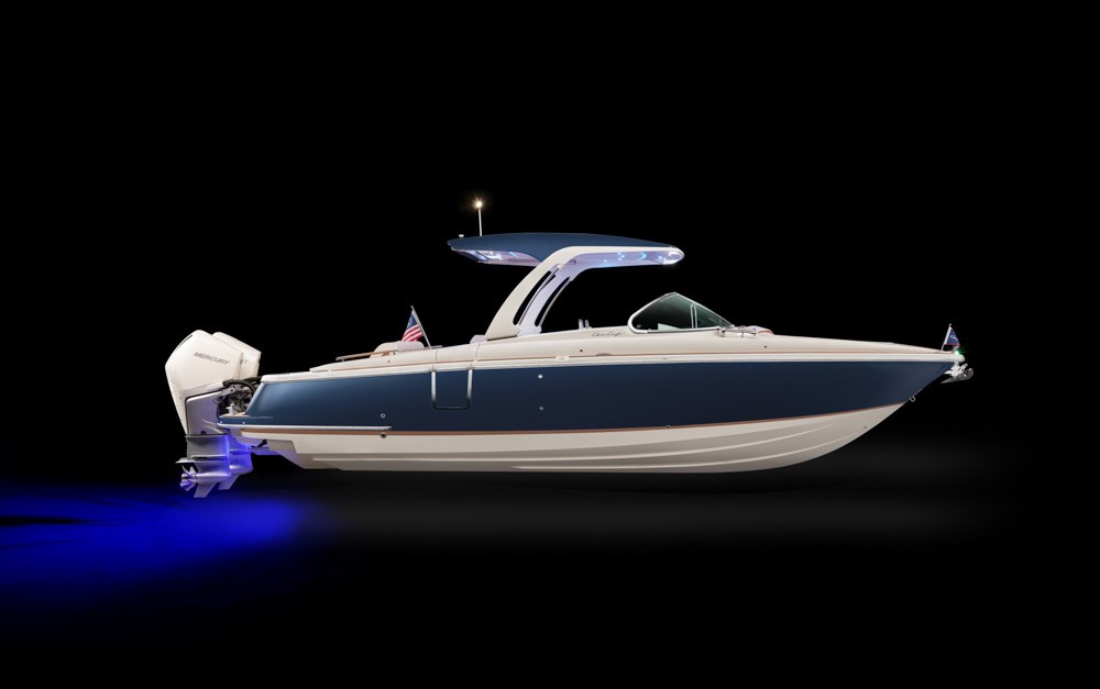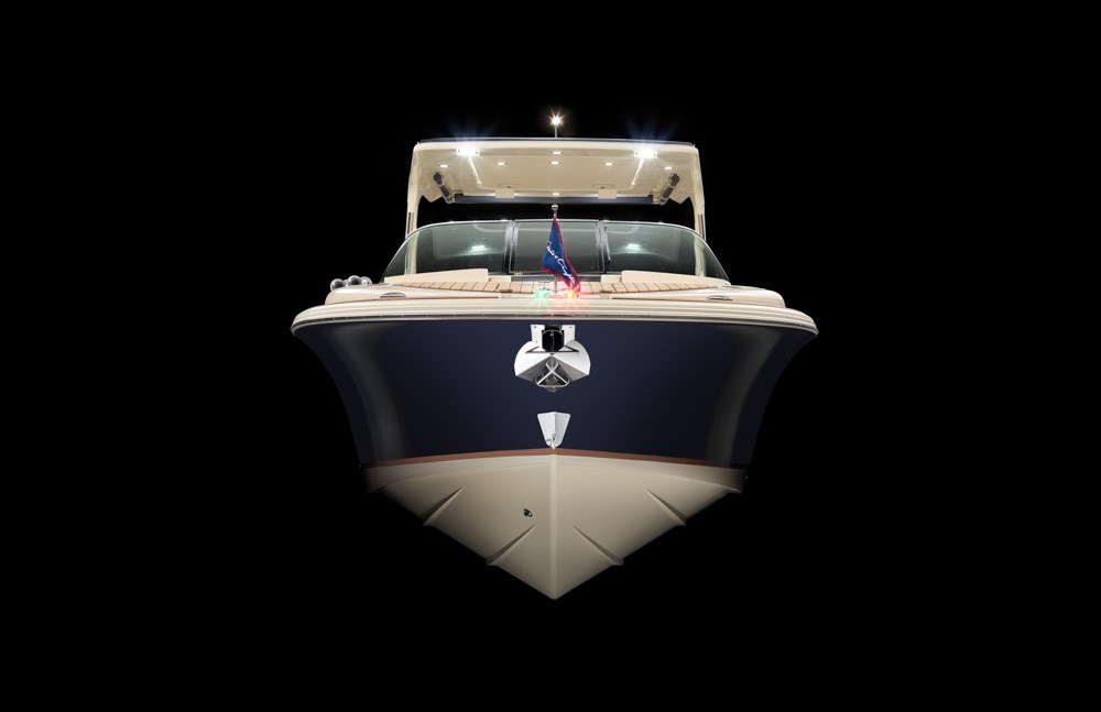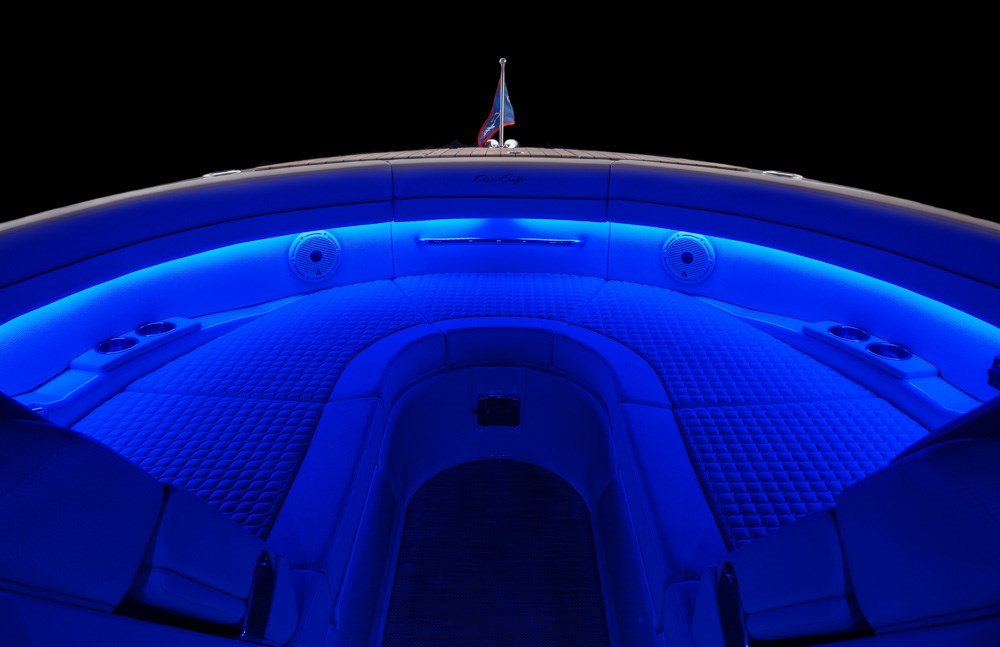 This model features a solid mahogany and stainless-steel accented helm and teak accents throughout. One of the most defining features of the GT line is the option to choose between sterndrive or outboard propulsion, making it truly customizable to the owner’s needs. Boarding is easy on the Launch 31 GT with a walkthrough transom and side door access. Owners can choose to light up the boat with an integrated full spectrum lighting system that coordinates multiple zones of lighting both in the boat and below the water, all controlled via the Garmin Glass Cockpit Display.