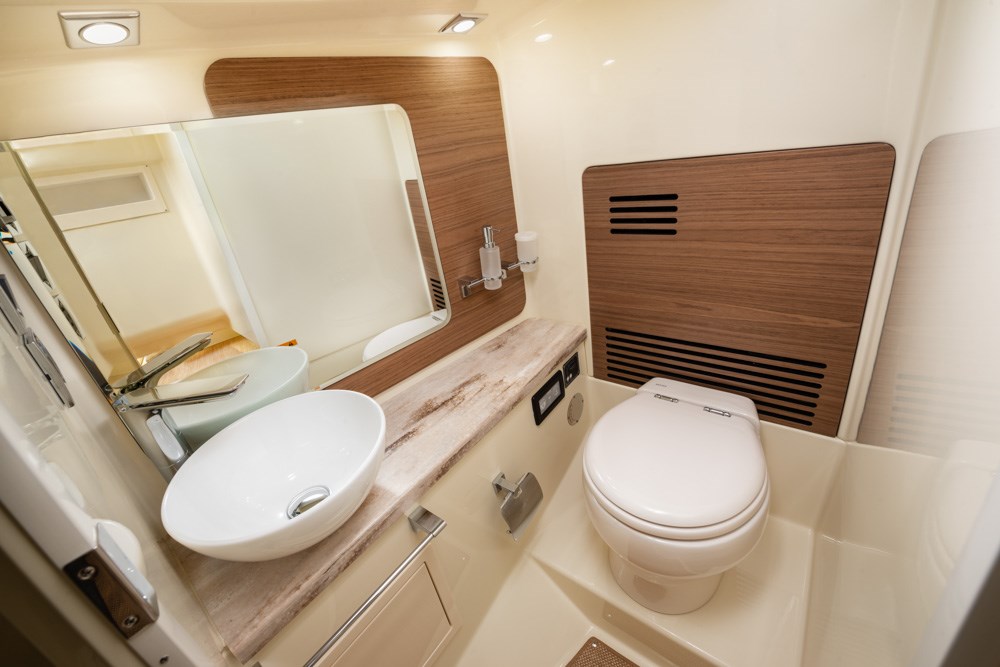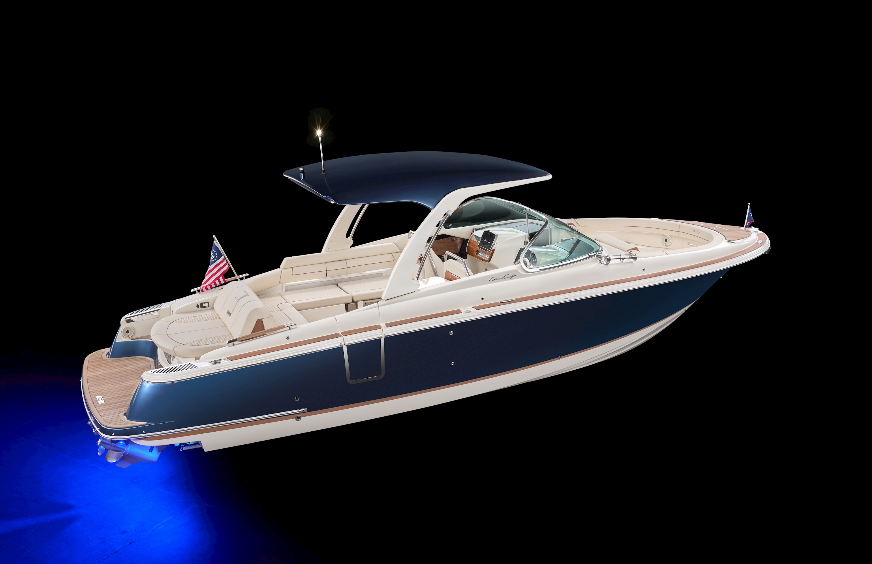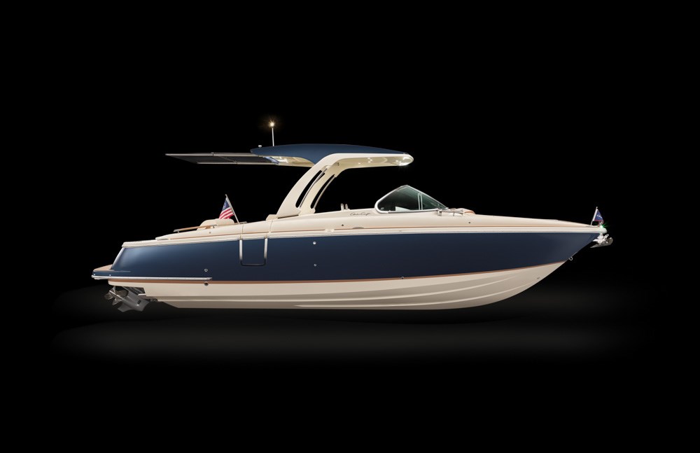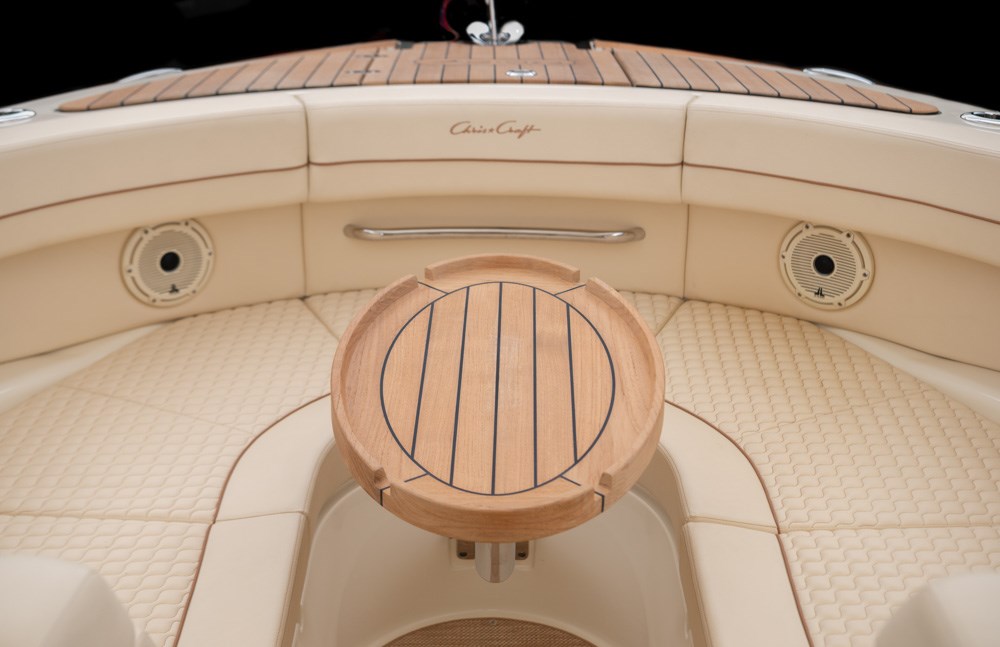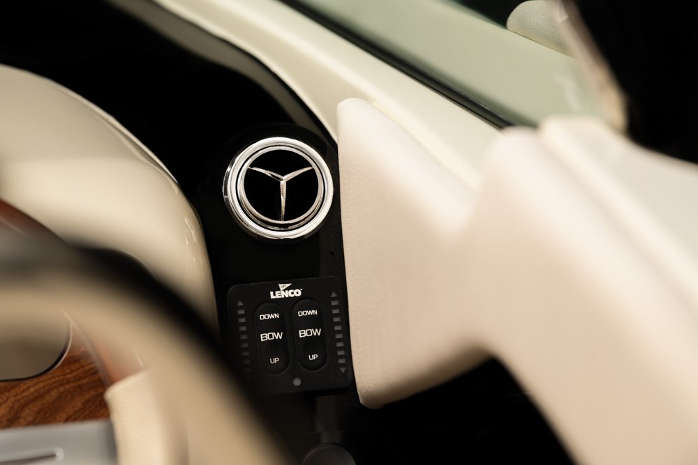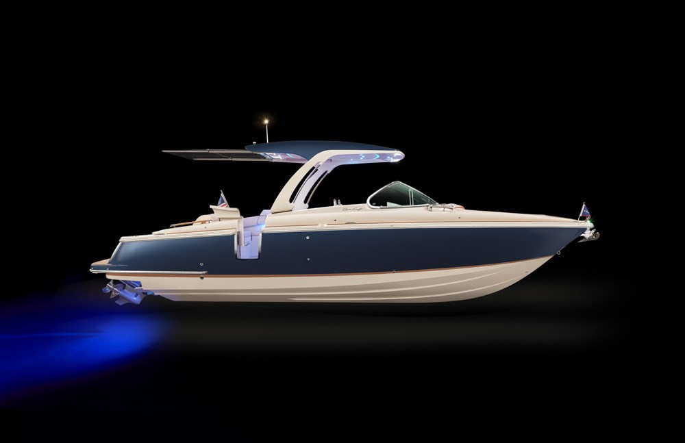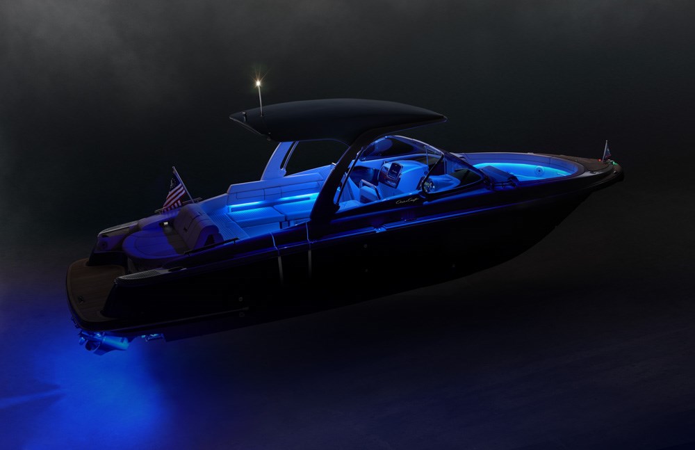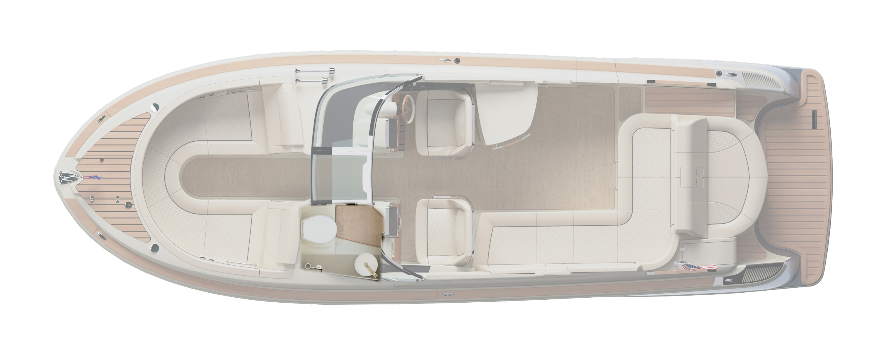This model features a solid mahogany and stainless-steel accented helm and teak accents throughout. One of the most defining features of the GT line is the option to choose between sterndrive or outboard propulsion, making it truly customizable to the owner’s needs. Boarding is easy on the Launch 31 GT with a walkthrough transom and side door access. Owners can choose to light up the boat with an integrated full spectrum lighting system that coordinates multiple zones of lighting both in the boat and below the water, all controlled via the Garmin Glass Cockpit Display.