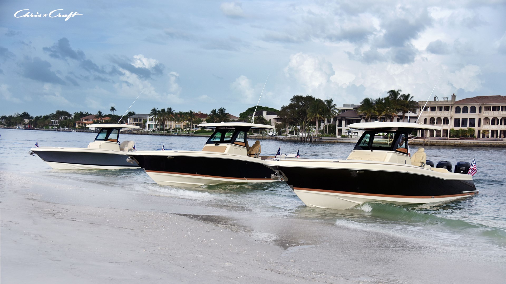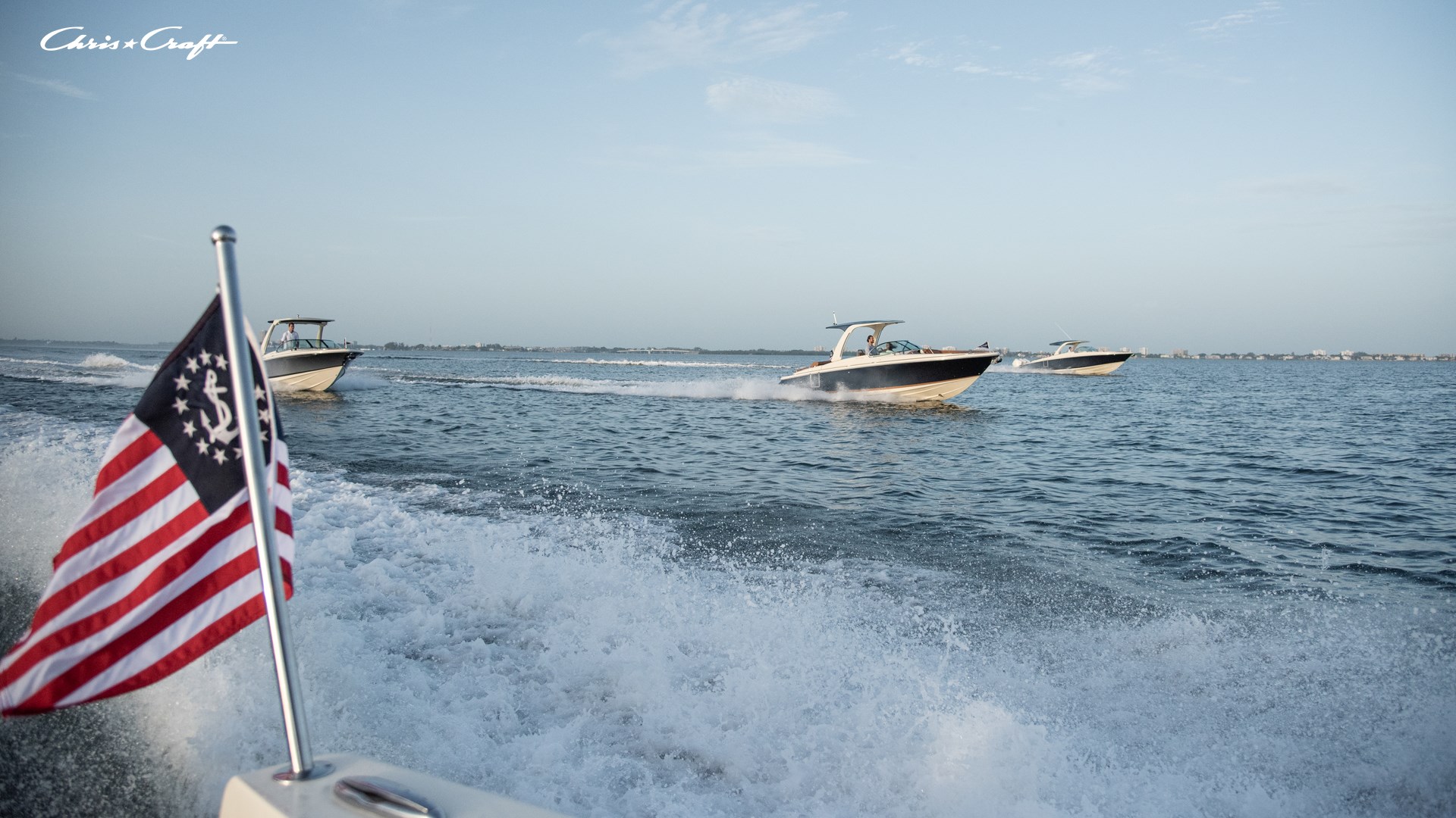 Ride aboard a Chris-Craft as three Launch GTs drive by: Download This Background