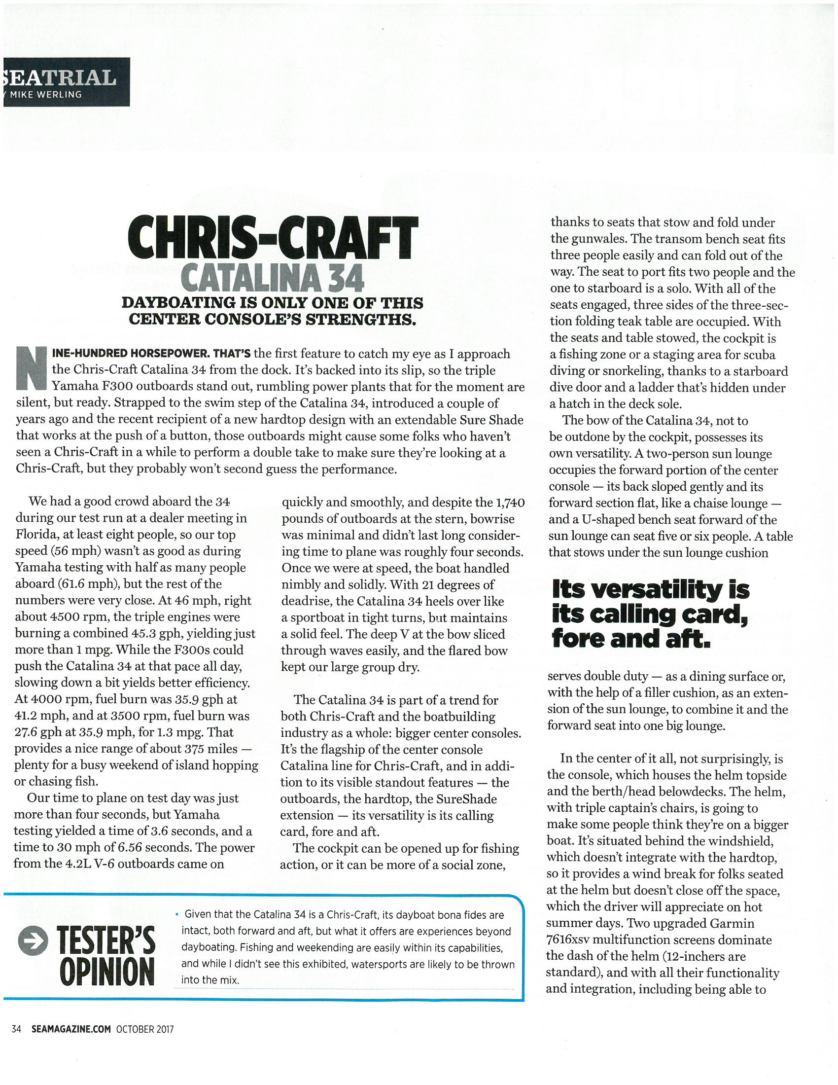 We had a good crowd aboard the 34 during our test run at a dealer meeting in Florida, at least eight people, so our top speed (56 mph) wasn’t as good as during Yamaha testing with half as many people aboard (61.6 mph), but the rest of the numbers were very close. At 46 mph, right about 4500 rpm, the triple engines were burning a combined 45.3 gph, yielding just more than 1 mpg. While the F300s could push the Catalina 34 at that pace all day, slowing down a bit yields better efficiency. At 4000 rpm, fuel burn was 35.9 gph at 41.2 mph, and at 3500 rpm, fuel burn was 27.6 gph at 35.9 mph, for 1.3 mpg. That provides a nice range of about 375 miles — plenty for a busy weekend of island hopping or chasing fish.