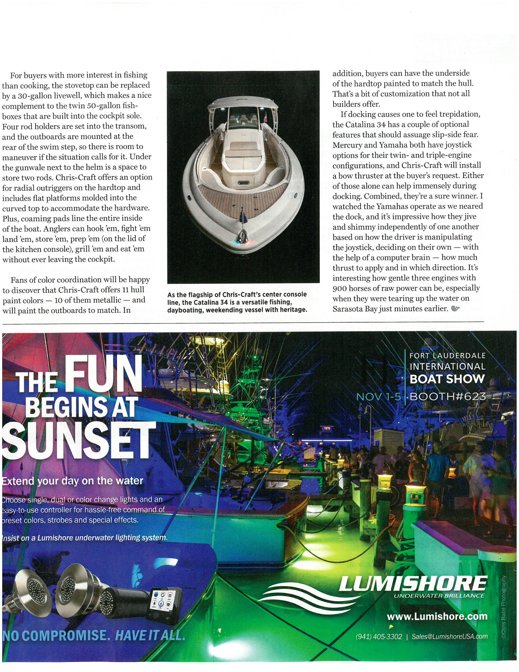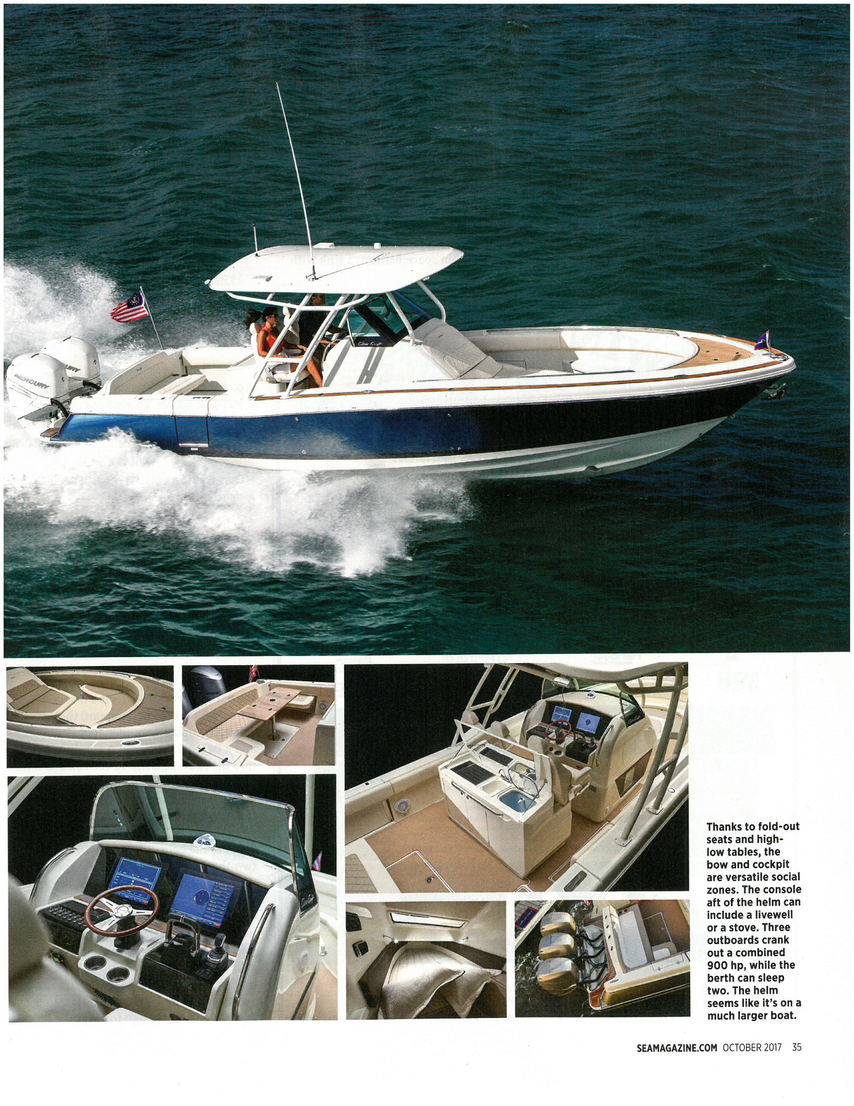 Nine-hundred horsepower. That’s the first feature to catch my eye as I approach the Chris-Craft Catalina 34 from the dock. It’s backed into its slip, so the triple Yamaha F300 outboards stand out, rumbling power plants that for the moment are silent, but ready. Strapped to the swim step of the Catalina 34, introduced a couple of years ago and the recent recipient of a new hardtop design with an extendable Sure Shade that works at the push of a button, those outboards might cause some folks who haven’t seen a Chris-Craft in a while to perform a double take to make sure they’re looking at a Chris-Craft, but they probably won’t second guess the performance.
